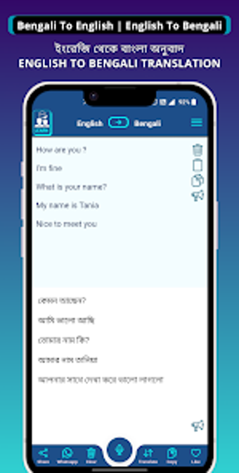 แอปพลิเคชันแปลภาษาบังกาลี - อังกฤษ เป็นเครื่องมือการศึกษาที่หลากหลายออกแบบมาเพื่อการแปลที่ราบรื่นระหว่างภาษาบังกาลีและอังกฤษ มันช่วยให้ผู้ใช้แปลคำ วลี และประโยคได้ทันที ทำให้เหมาะสำหรับทั้งผู้เรียนทั่วไปและผู้เรียนที่จริงจัง แอปนี้รองรับการป้อนข้อมูลด้วยเสียงและข้อความ ทำให้มั่นใจได้ว่าผู้ใช้สามารถสื่อสารได้อย่างมีประสิทธิภาพไม่ว่าจะแบบไหนก็ตาม นอกจากนี้ยังมีฟีเจอร์เช่นการช่วยออกเสียง บันทึกประวัติการแปลก่อนหน้า และส่วนโปรดสำหรับการเข้าถึงวลีที่ใช้บ่อยได้ง่าย